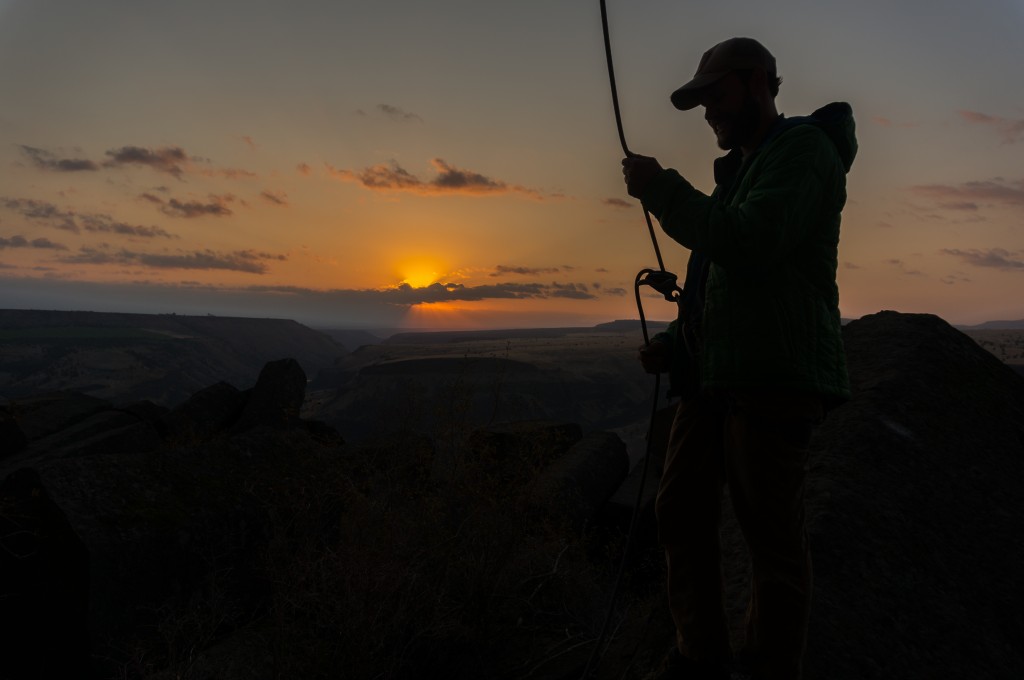 The sun setting on central Oregon and our belay device review.