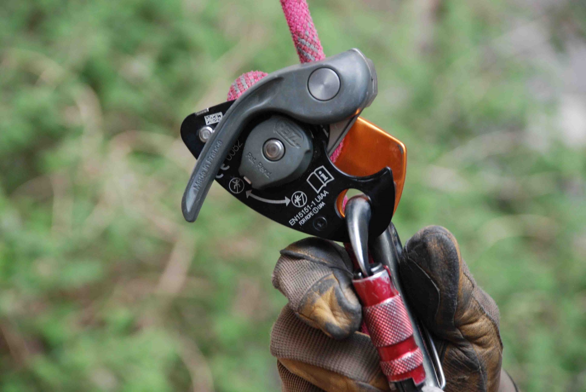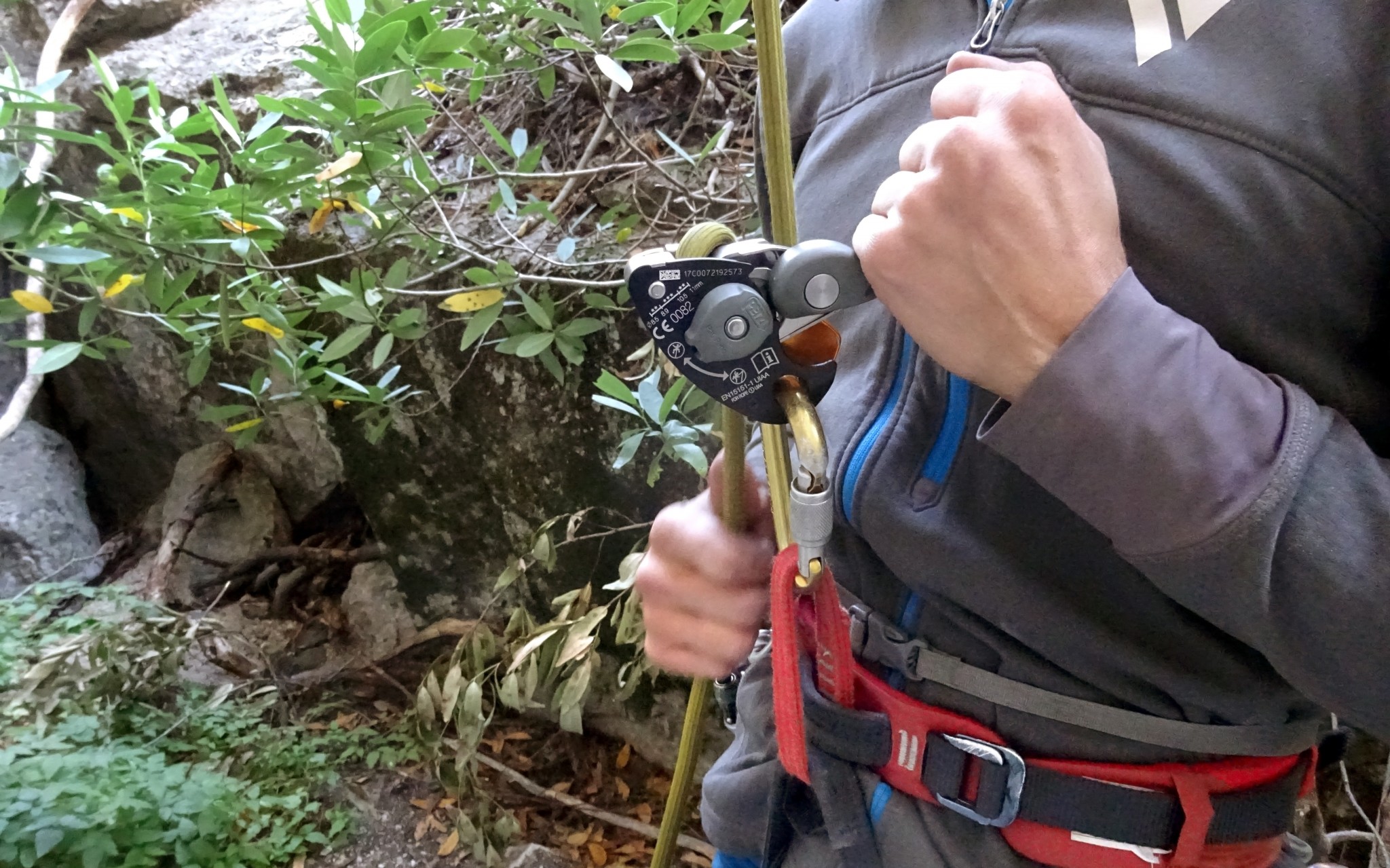 Lowering with the GriGri requires opening the retractable handle in order to release the cam as it grips the rope. Tension and speed are controlled by this handle, as well as the second hand on the brake strand, as shown.