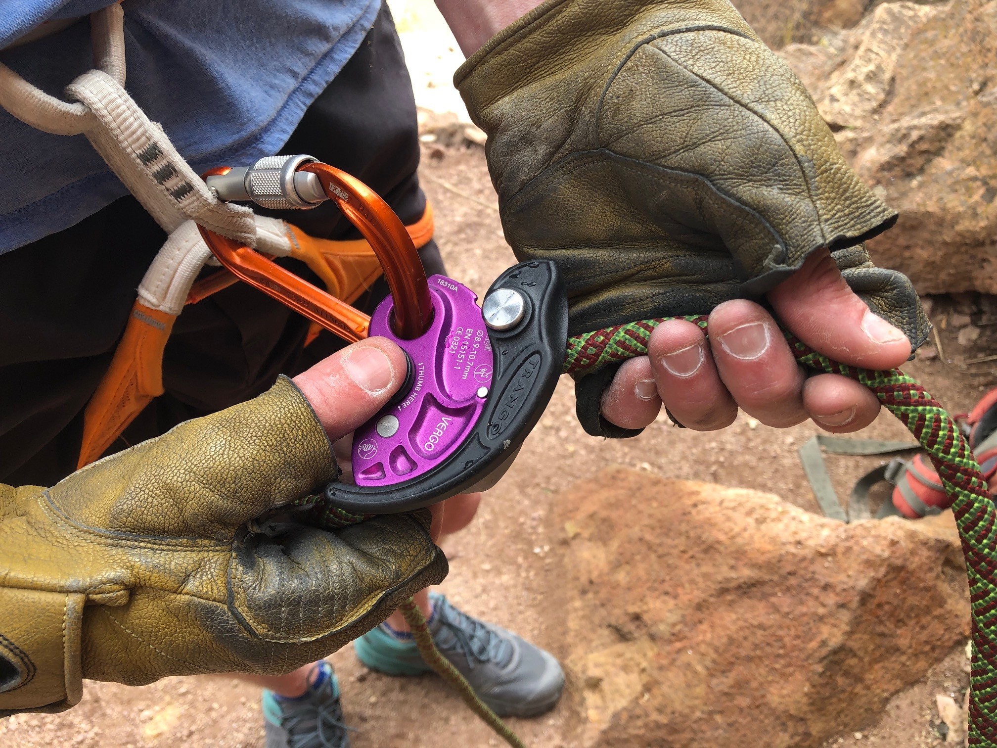 The Trango Vergo is very similar to the Petzl GriGri, with some important differences. First, with the Vergo, there is no temptation to override the rope grabbing component when feeding out slack. And second, the Vergo features an ergonomic and comfortable orientation that makes paying out slack a breeze. It has as much rope-grabbing bite as the GriGri and GriGri+ and lowers in a similar manner. Our testers found themselves reaching for this device more than any other when belaying leaders and when packing up for a day at the sport-climbing crag where leading is the norm.
