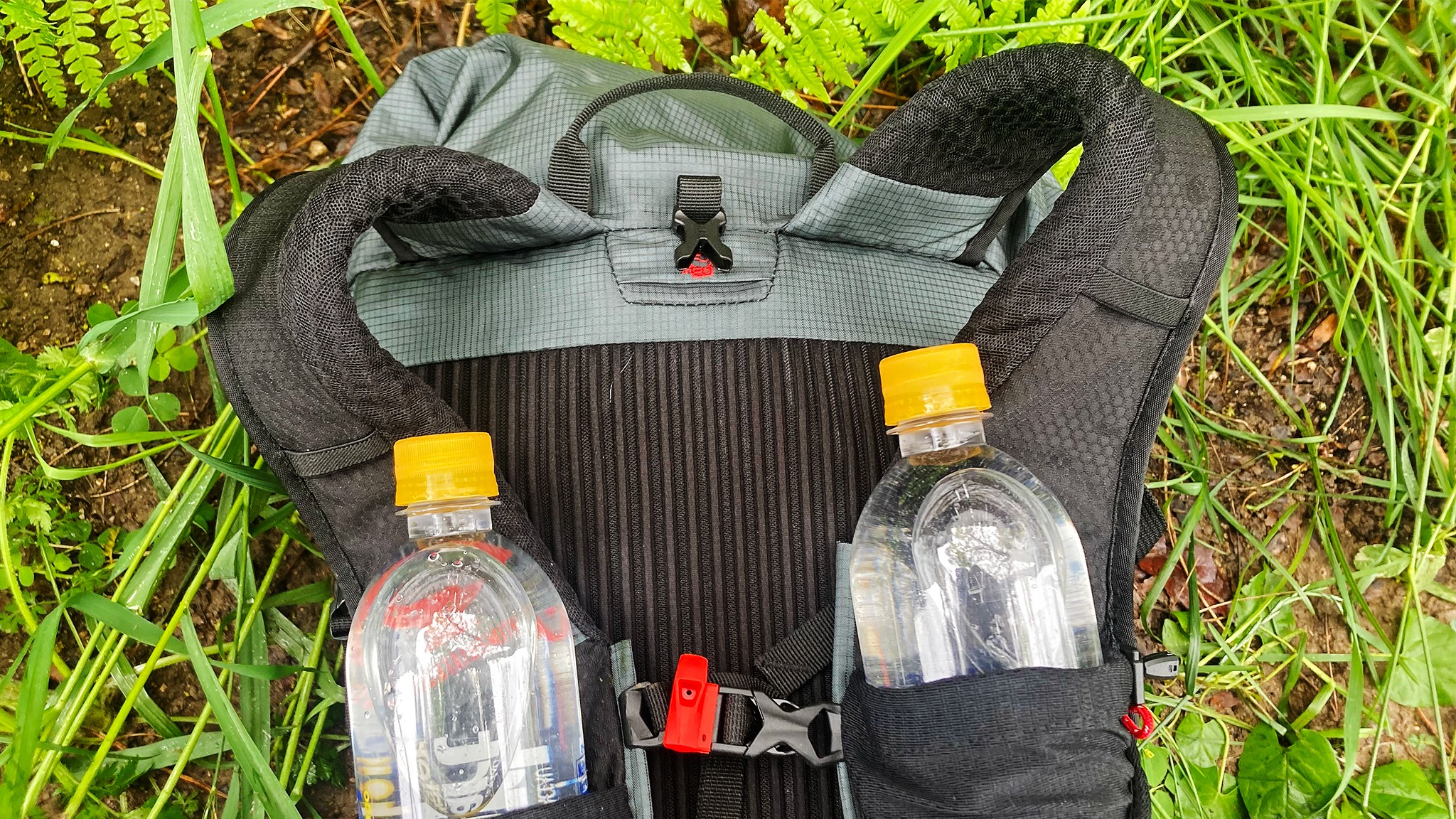 The Mountainsmith Zerk has a whistle on the sternum strap and shoulder pockets that can easily fit these 700-milliliter Smartwater bottles.